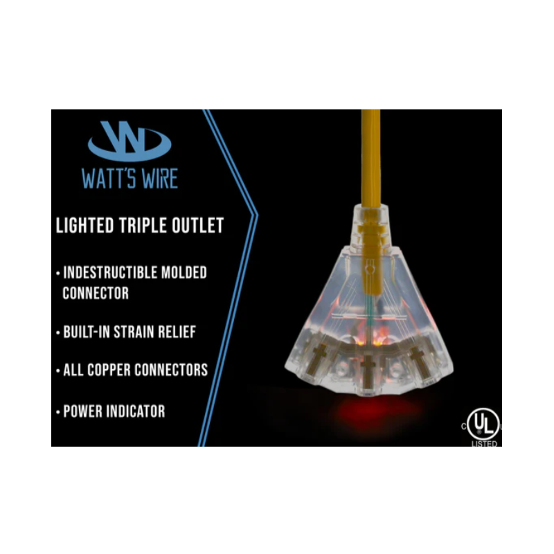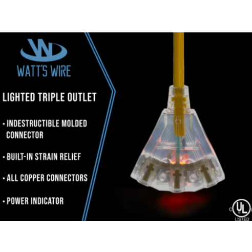 WatssWire, Cable de extensión SJTW de 10 AWG 50 pies con toma de tierra y múltiples tomas (amarillo) - por Watt's Wire