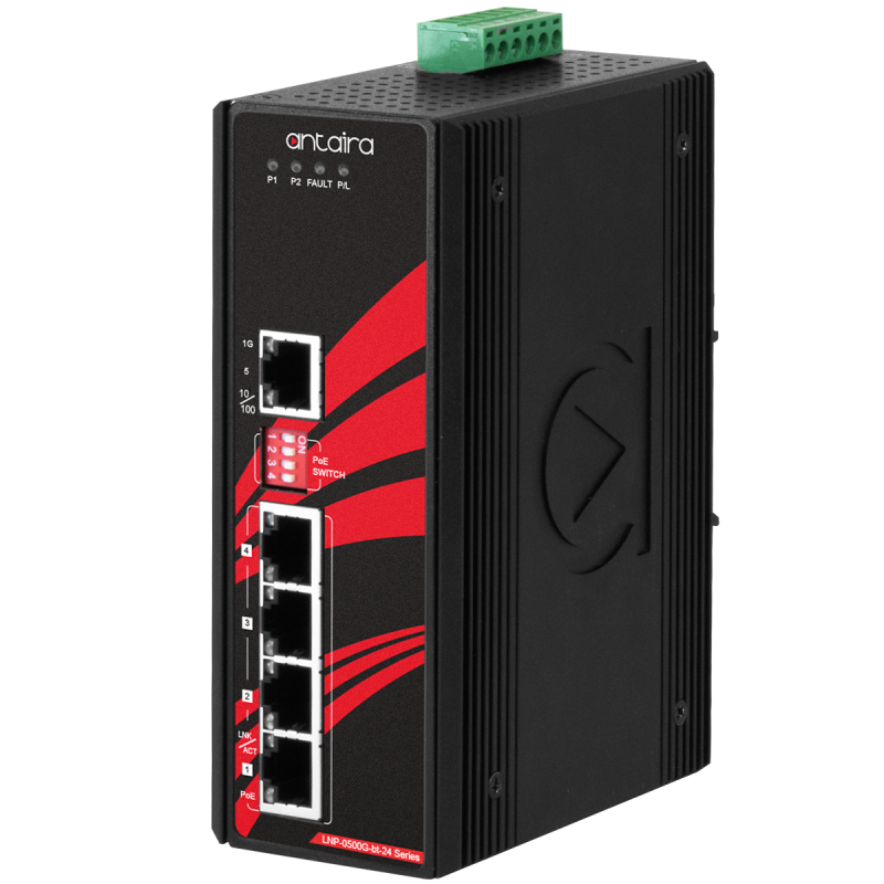 El LNP-0500G-bt-24-T tiene clasificación IP30 y se puede montar en carril DIN. También hay un rango de temperatura ampliado: de -40 °C a 75 °C. También proporciona conectividad Ethernet con funciones PoE para entornos de aplicaciones de automatización industrial hostiles o al aire libre, como vigilancia de seguridad, sistemas de monitoreo de tráfico ITS, petróleo/gas y minería, gestión de instalaciones para energía/servicios públicos, plantas de tratamiento de aguas residuales de agua y, por último, líneas de producción automatizadas en la automatización de fábricas.