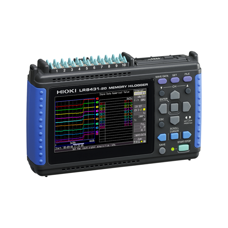Los Hioki Memory HiLoggers son registradores de datos de alta velocidad para registrar múltiples canales de señales de voltaje, temperatura, pulso o rotación, proporcionando un aislamiento completo entre los canales y una fuerte resistencia al ruido. El LR8431 registra datos a velocidades de 10 ms en 10 canales simultáneamente y cuenta con una pantalla LCD de color brillante para mostrar formas de onda nítidas.