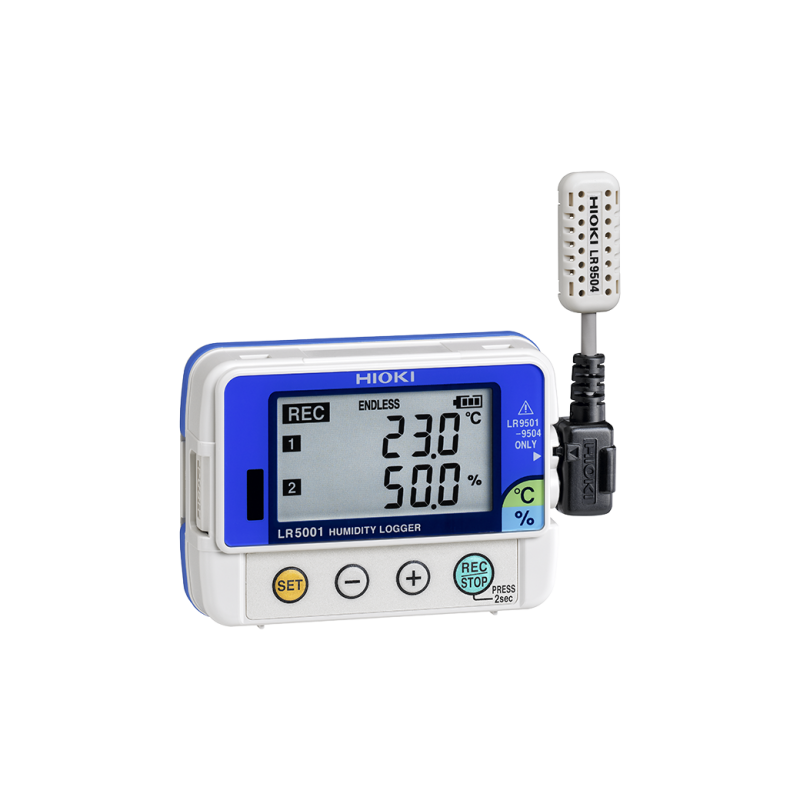 Los registradores de datos compactos de 1 o 2 canales de Hioki cuentan con una memoria de 60 000 conjuntos de datos/canales para medir la temperatura, la humedad, el voltaje o las señales de instrumentación. El LR5001 registra la temperatura y la humedad en 2 canales en intervalos de tan solo 1 segundo.