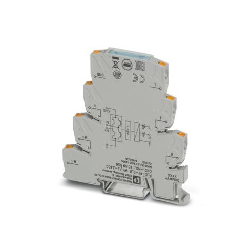 PLC-INTERFACE como relé electrónico de carga de inversión, compuesto de borna de base PLC-BPT.../21 con conexión push-in y circuito integrado, para controlar motores DC con indicador luminoso y circuito de protección, salida: 10 ... 30 V DC/2 A