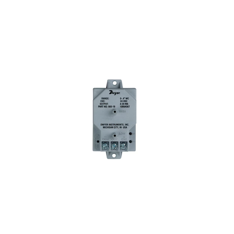 Nuestro económico transmisor de presión diferencial Serie 668 mide bajas presiones con una precisión de ±1 %, ideal para la presurización adecuada de edificios y el control del flujo de aire. Los transmisores soportan una sobrepresión de hasta 10 psig sin sufrir daños. El diseño del sensor de capacitancia variable proporciona una excelente sensibilidad y estabilidad a largo plazo. Su diseño compacto y ligero facilita la instalación. Las unidades también cuentan con protección contra inversión de polaridad.