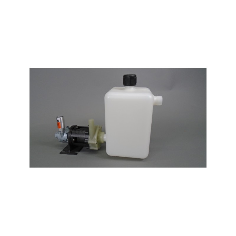 La bomba industrial TE-5C-MD-AM de March Pump, con cámara autocebante de 750 W, es una bomba centrífuga americana de accionamiento magnético sin sello, ideal para aplicaciones como recirculación y transferencia de productos químicos, y sistemas de depuración. Tiene capacidad para generar un caudal máximo de 17 galones por minuto a 4 pies (1,2 m) y una altura máxima de 50 pies (21 PSI). El extremo húmedo estándar (los materiales que entran en contacto con la solución) está compuesto de polipropileno, polietileno de alta densidad, vitón y cerámica. La conexión de entrada es una rosca hembra de 1 pulgada (2,54 cm) y la de salida es una rosca macho de 1/2 pulgada (1,27 cm). El motor estándar es un motor neumático de 0,125 HP que requiere 60 PSI (3,67 kg/cm²). La presión interna máxima que tolera la bomba es de 25 PSI (3,67 kg/cm²) y la temperatura máxima del líquido es de 130 Fahrenheit (54 °C). La bomba centrífuga de accionamiento magnético March TE-5C-MD-AM con cámara autocebante de 750 W es capaz de manipular productos químicos, ácidos y disolventes de corrosivos moderados a altos. Para determinar si la March TE-5C-MD-AM con cámara autocebante de 750 W es adecuada para su aplicación, póngase en contacto con March Pump.