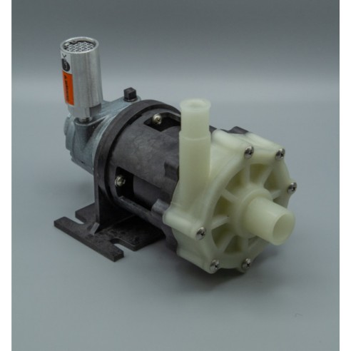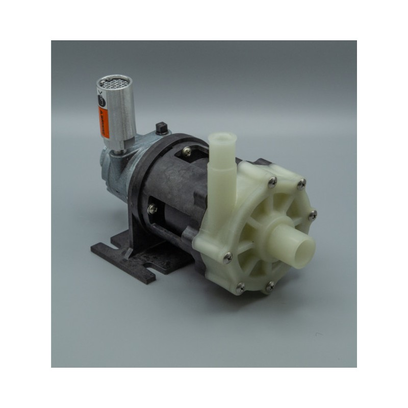 La bomba industrial BC-4A-MD-AM de March Pump es una bomba centrífuga de accionamiento magnético sin sello, ideal para aplicaciones como recirculación y transferencia de productos químicos, así como para sistemas de depuración. Tiene una capacidad de generar un caudal máximo de 18 galones por minuto a 1 pie (30 cm) y una altura máxima de 50 pies (21 psi).