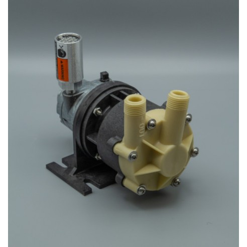 La bomba industrial MDK-MT3-AM de March Pump es una bomba centrífuga de accionamiento magnético sin sello, de fabricación estadounidense, ideal para aplicaciones como la recirculación y transferencia de productos químicos. Puede generar un caudal máximo de 9 galones por minuto a 1 pie (30 cm) y su altura máxima es de 28 pies (12 psi). El extremo húmedo estándar (los materiales que entran en contacto con la solución) está compuesto de Kynar reforzado con fibra de vidrio (PVDF), Viton y cerámica. La conexión de entrada es de 1/2 pulgada (1,27 cm) y la de salida es de 1/2 pulgada (1,27 cm). El motor estándar es un motor de aire comprimido de 0,125 caballos de fuerza (HP) que requiere 21 psi (1,27 cm). La presión interna máxima que tolera la bomba es de 75 psi (2,37 cm) y la temperatura máxima del líquido es de 200 grados Fahrenheit (93 grados Celsius). La bomba centrífuga de accionamiento magnético March MDK-MT3-AM es capaz de manipular productos químicos, ácidos y disolventes de corrosivos leves a altos. Para determinar si el March MDK-MT3-AM es adecuado para su aplicación, comuníquese con March Pump.