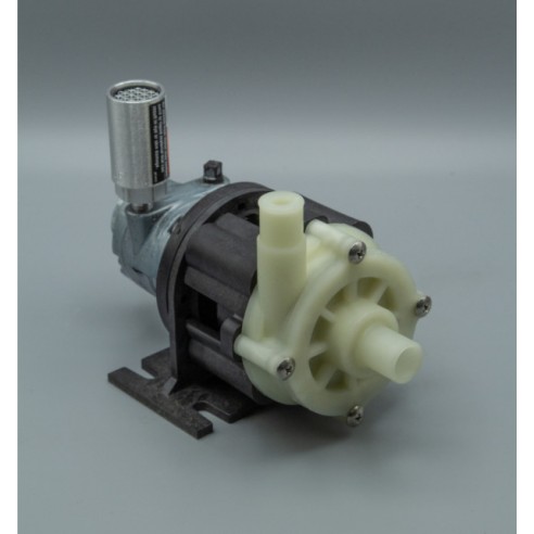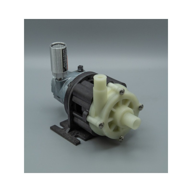 La bomba industrial BC-3AP-MD-AM de March Pump es una bomba centrífuga de accionamiento magnético sin sello, ideal para aplicaciones como la recirculación y transferencia de productos químicos. Puede generar un caudal máximo de 10 galones por minuto a 5 pies (1,5 m) y su altura máxima es de 42 pies (18 psi).
