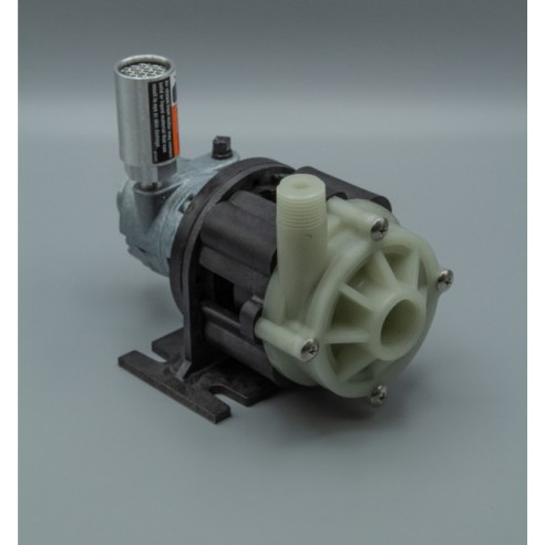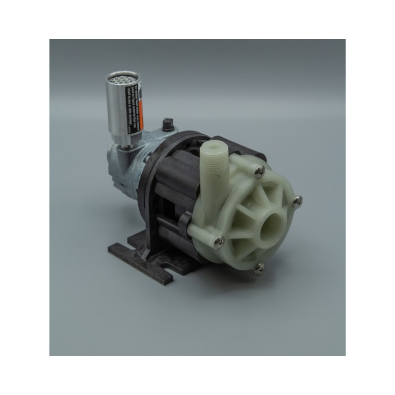 La bomba industrial BC-3CP-MD-AM de March Pump es una bomba centrífuga de accionamiento magnético sin sello, ideal para aplicaciones como la recirculación y transferencia de productos químicos. Puede generar un caudal máximo de 10 galones por minuto a 5 pies (1,5 m) y su altura máxima es de 42 pies (18 PSI). El extremo húmedo estándar (los materiales que entran en contacto con la solución) está compuesto de polipropileno, Viton y cerámica. La conexión de entrada es una rosca hembra de 3/4 de pulgada (19 mm) y la de salida es una rosca macho de 1/2 pulgada (12,7 mm). El motor estándar es un motor de aire comprimido de 0,125 HP que requiere 29 PSI (12,7 mm). La presión interna máxima que tolera la bomba es de 50 PSI (29 psi) y la temperatura máxima del líquido es de 190 Fahrenheit (87 °C). La bomba centrífuga de accionamiento magnético March BC-3CP-MD-AM es capaz de manipular productos químicos, ácidos y disolventes de corrosivos leves a altos. Para determinar si el March BC-3CP-MD-AM es adecuado para su aplicación, comuníquese con March Pump.