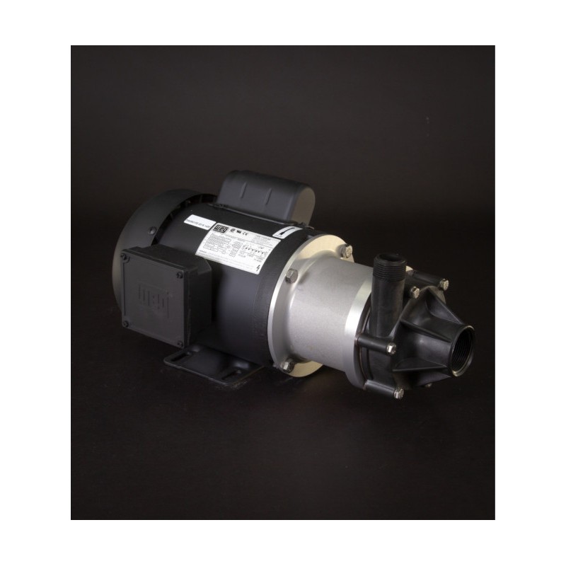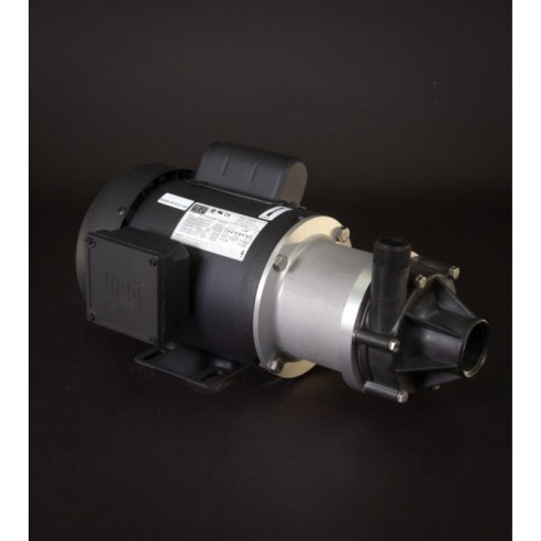 La bomba industrial TE-7R-MD de March Pump es una bomba centrífuga de accionamiento magnético sin sello, ideal para aplicaciones como recirculación y transferencia de productos químicos, y sistemas de depuración. Tiene capacidad para generar un caudal máximo de 53 galones por minuto a 10 pies (3 metros) y una altura máxima de 60 pies (26 psi). El extremo húmedo estándar (los materiales que entran en contacto con la solución) está compuesto de polipropileno, Ryton-Viton, Ryton/Teflón/Carbono y cerámica. La conexión de entrada es una rosca hembra de 1-1/2" y la de salida es una rosca macho de 1". Dispone de dos motores estándar: uno monofásico de 60 Hz, 115/208/230 V y otro de 50 Hz, 115/230 V, de 0,75 hp, totalmente cerrado y refrigerado por ventilador. El segundo es un motor trifásico de 60 Hz, 208/230/460 V y 50 Hz, 190/380 V, de 0,75 caballos de fuerza, totalmente cerrado y refrigerado por ventilador. Existen diferencias de rendimiento entre las opciones de Hz. La presión interna máxima que la bomba puede tolerar es de 50 PSI y la temperatura máxima del líquido es de 190 Fahrenheit (87 Celsius). La bomba centrífuga de accionamiento magnético March TE-7R-MD es capaz de manipular productos químicos, ácidos y disolventes de ligeramente a muy corrosivos. Para determinar si la March TE-7R-MD es adecuada para su aplicación, póngase en contacto con March Pump.
