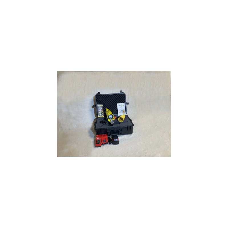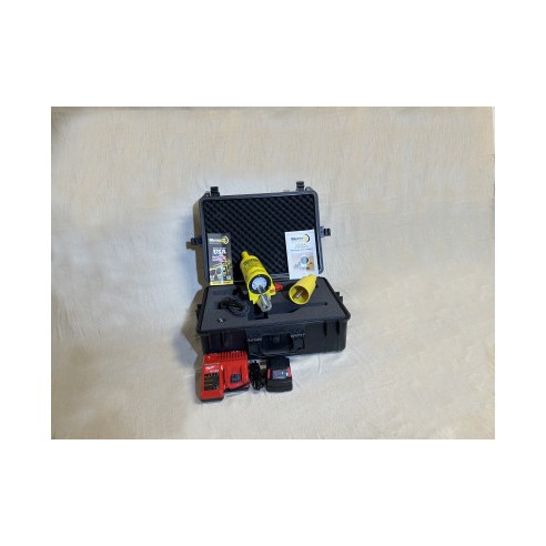 El dispositivo HI Pot está diseñado para desactivar cables de clase 15kV desactivados con Hi Pot. La herramienta transforma 18 voltios de la batería a aproximadamente 8.000 voltios de corriente continua. Cuando la batería está instalada y el interruptor de seguridad está en posición de apagado, la unidad entra en modo de detección de voltaje. La unidad debe estar en esta posición al instalar el dispositivo, ya que emitirá una alarma de advertencia si te acercas a una fuente energizada. Cuando se levanta el interruptor de seguridad y se activa el interruptor de palanca, la unidad está en modo Hi-Pot y se aplica la corriente continua de alta tensión.