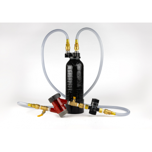 Una parte del agua que fluye a través del Dechlor Demon™ se desvía a través del bypass hacia el tanque de mezcla, donde se combina con un agente desclorante concentrado. El flujo de derivación se controla mediante una válvula indicadora de precisión. El concentrado se reintroduce en el Demonio™ Dechlor, donde sigue mezclándose con el agua que fluye. El cloro se neutraliza cuando sale de la manguera.